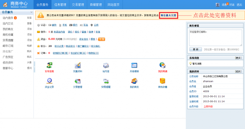 4.点击提交,注册成功,页面自动返回首页,点击“我的灯都购”或者“商务中心”,可进入会员商务中心页面:
