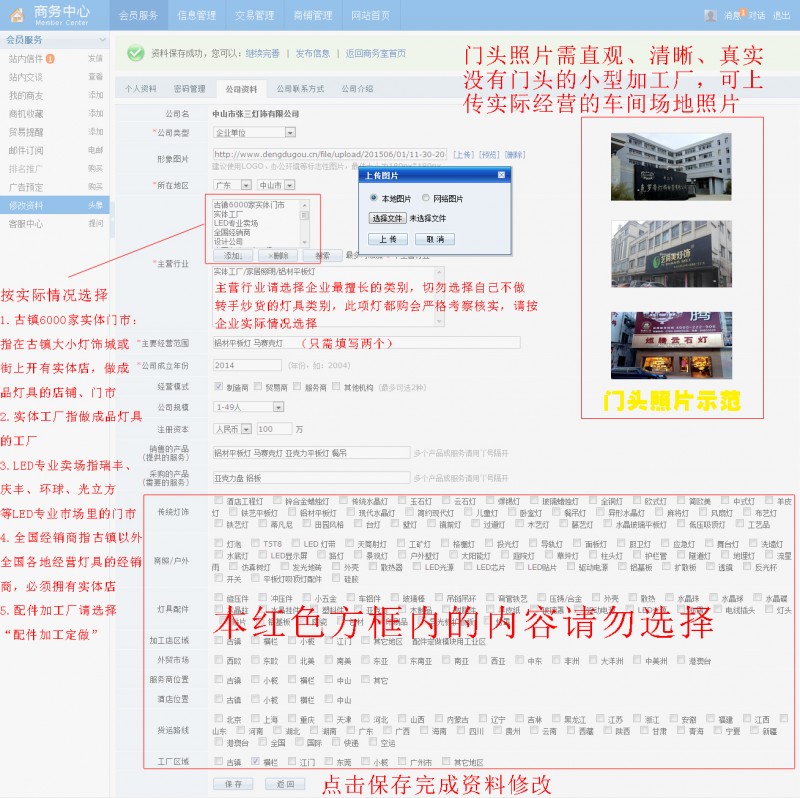 6.完善企业信息,请参照说明图填写。上传公司门头,门头照片务必规范、真实、清晰。门市上传门市门头,工厂上传工厂门头。